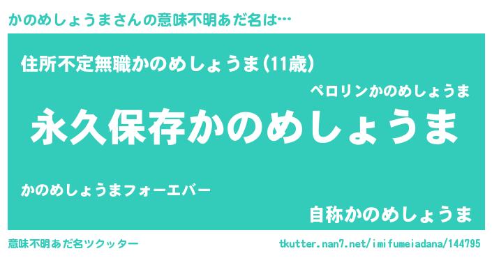 | 男性向けラノベタイトル風あだ名 | 『かのめしょうまという概念が存在しない退屈な世界 』 |