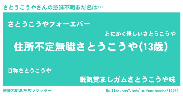 | 男性向けラノベタイトル風あだ名 | 『うちのさとうこうやが世界を掌握している!』 |