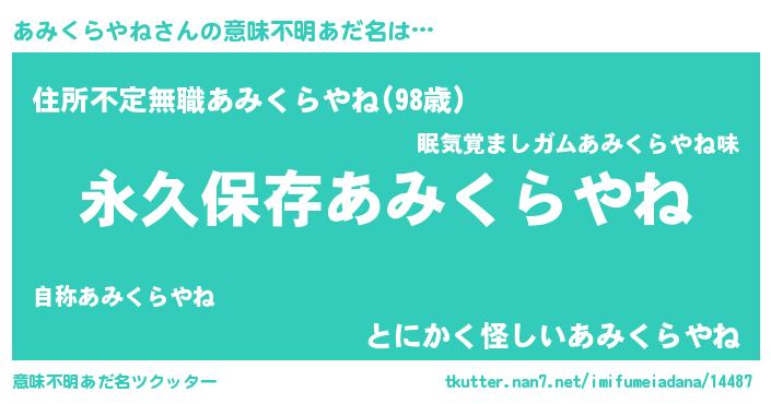 | 女子向けラノベタイトル風あだ名 | 『異世界で失敗しない100のあみくらやね』 |