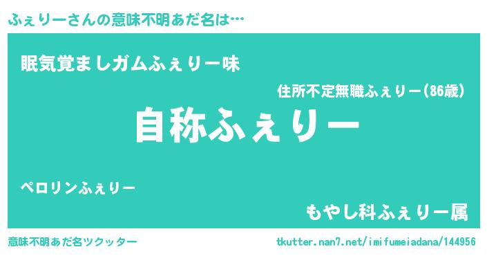 | 男性向けラノベタイトル風あだ名 | 『Re:ふぇりーから始める異世界生活』 |