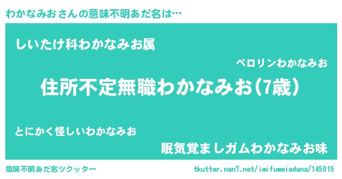 | 男性向けラノベタイトル風あだ名 | 『この素晴らしい世界にわかなみおを!』 |