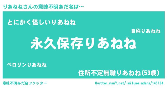 | 胡散臭い通販商品みたいなあだ名 | 『来世でも幸せになれる水素水…その名も「りあねね」』 |