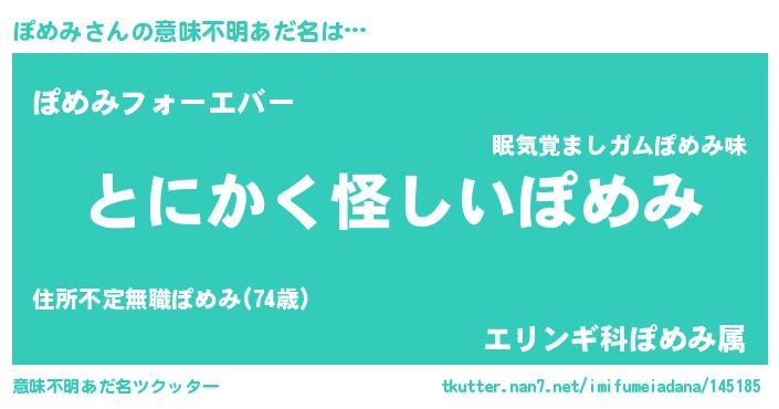 | 女子向けラノベタイトル風あだ名 | 『ぽめみ様がみてる』『ぽめみ伯爵の花嫁』 |