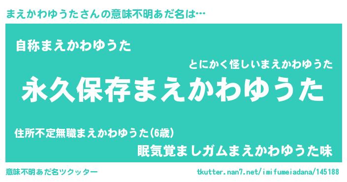 | 男性向けラノベタイトル風あだ名 | 『まえかわゆうたという概念が存在しない退屈な世界 』 |