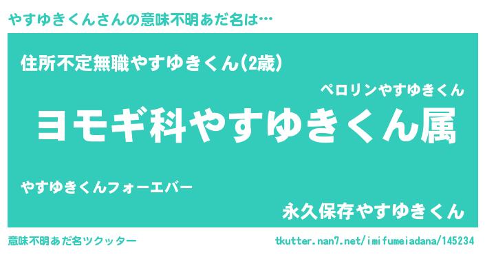 | 男性向けラノベタイトル風あだ名 | 『やすゆきくん~年齢イコール彼女いない歴の魔法使い~』 |