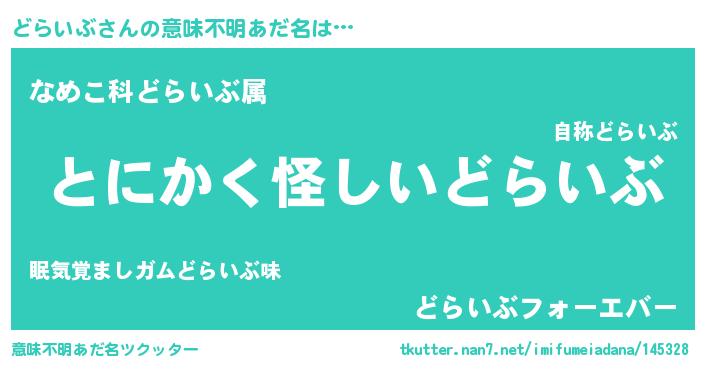 | 男性向けラノベタイトル風あだ名 | 『どらいぶの嫁は女の子じゃないと思った?』 |