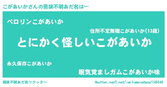 | 胡散臭い通販商品みたいなあだ名 | 『信頼と実績のサプリメント…その名も「こがあいか」』 |