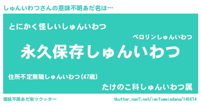 | 男性向けラノベタイトル風あだ名 | 『しゅんいわつという概念が存在しない退屈な世界 』 |