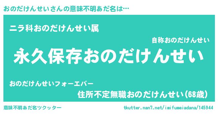 | 男性向けラノベタイトル風あだ名 | 『おのだけんせいという概念が存在しない退屈な世界 』 |