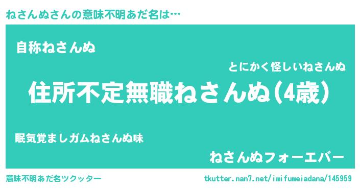 | 女子向けラノベタイトル風あだ名 | 『ねさんぬが死なない童話 林檎のねさんぬの診療簿』 |