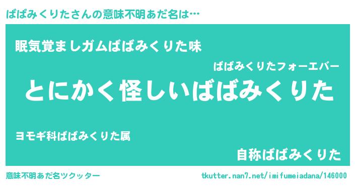 | 男性向けラノベタイトル風あだ名 | 『うちのばばみくりたが世界を掌握している!』 |