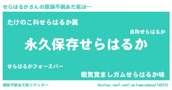 | 男性向けラノベタイトル風あだ名 | 『せらはるかという概念が存在しない退屈な世界 』 |