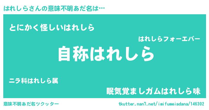 | 男性向けラノベタイトル風あだ名 | 『Re:はれしらから始める異世界生活』 |