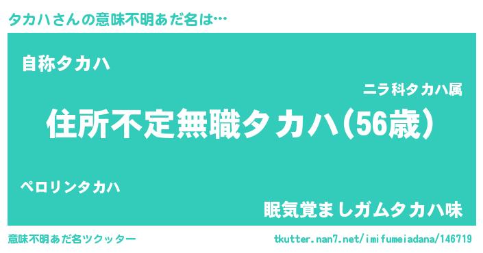 | 男性向けラノベタイトル風あだ名 | 『魔弾の王とタカハ』 |