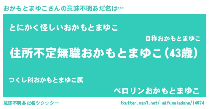 | 男性向けラノベタイトル風あだ名 | 『魔弾の王とおかもとまゆこ』 |