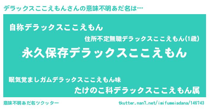 | 男性向けラノベタイトル風あだ名 | 『デラックスここえもんという概念が存在しない退屈な世界 』 |