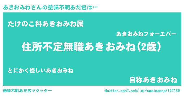 | 男性向けラノベタイトル風あだ名 | 『この素晴らしい世界にあきおみねを!』 |