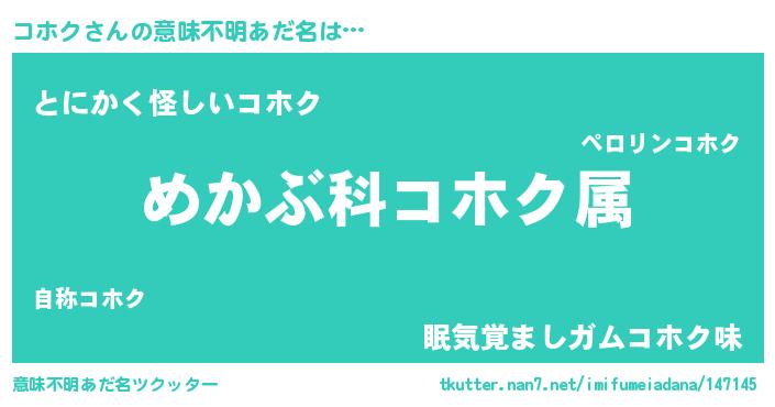 | 男性向けラノベタイトル風あだ名 | 『コホクスレイヤー』『コホクの憂鬱』 |