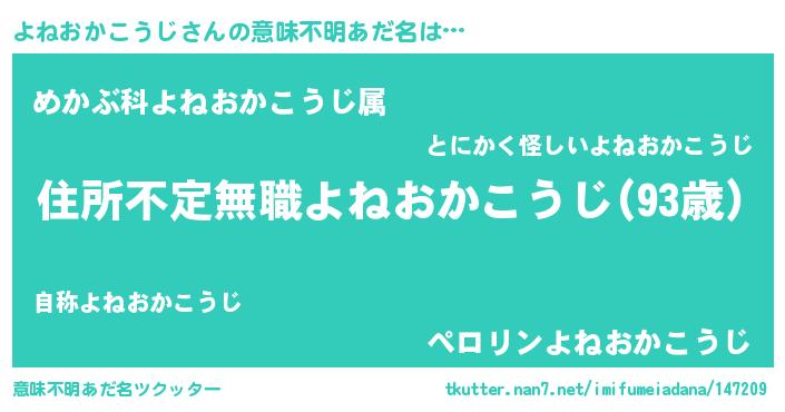 | 男性向けラノベタイトル風あだ名 | 『この素晴らしい世界によねおかこうじを!』 |
