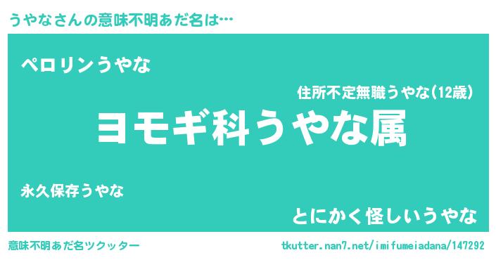 | 男性向けラノベタイトル風あだ名 | 『うやな~年齢イコール彼女いない歴の魔法使い~』 |