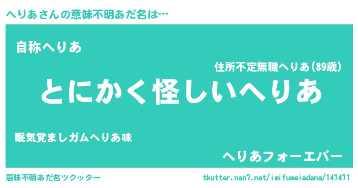 | 女子向けラノベタイトル風あだ名 | 『へりあの卵を拾いまして』『闇のへりあ』 |