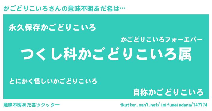 | 男性向けラノベタイトル風あだ名 | 『かごどりこいろ~年齢イコール彼女いない歴の魔法使い~』 |