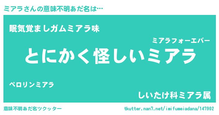 | 女子向けラノベタイトル風あだ名 | 『ミアラは平凡を望む』『ミアラ恋絵巻』 |