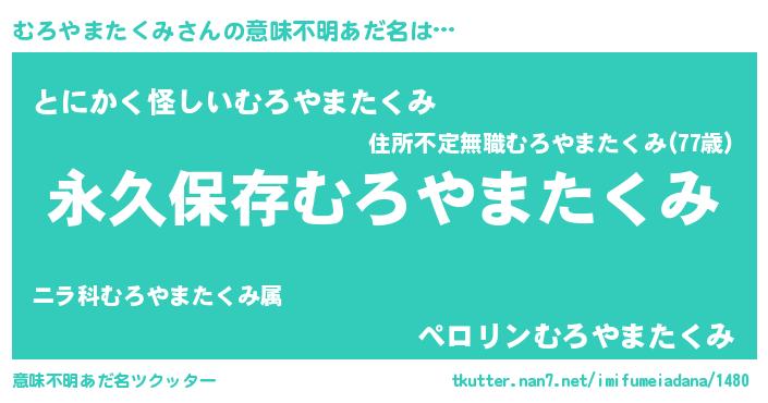 | ヘコむあだ名 | 『むろやまたくみ(笑)』『むろぷりん』 |