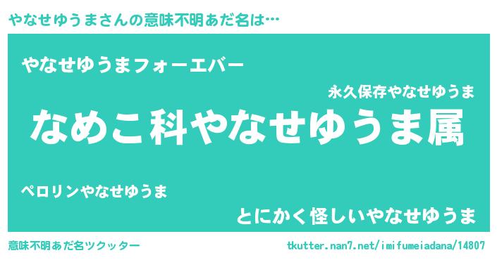 | 女子向けラノベタイトル風あだ名 | 『やなせゆうまの玉の輿計画!』 |