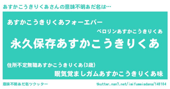 | 男性向けラノベタイトル風あだ名 | 『あすかこうきりくあという概念が存在しない退屈な世界 』 |