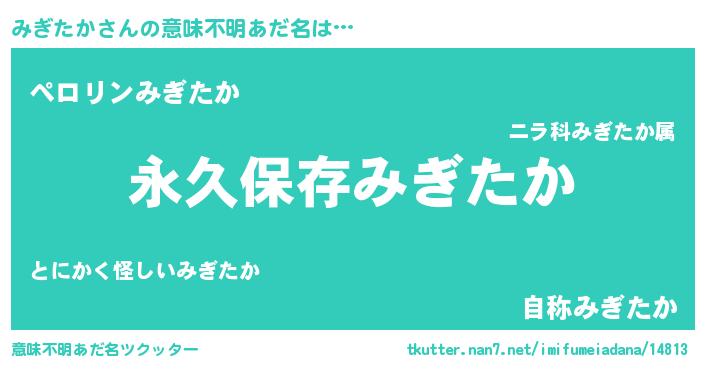 | 男性向けラノベタイトル風あだ名 | 『みぎたかという概念が存在しない退屈な世界 』 |