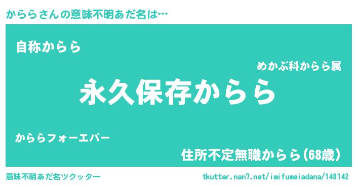 | 男性向けラノベタイトル風あだ名 | 『かららという概念が存在しない退屈な世界 』 |