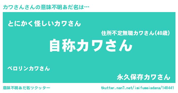 | 男性向けラノベタイトル風あだ名 | 『Re:カワさんから始める異世界生活』 |