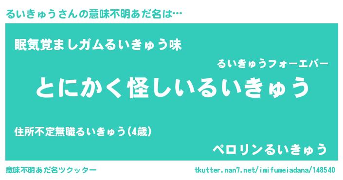 | 男性向けラノベタイトル風あだ名 | 『るいきゅうの嫁は女の子じゃないと思った?』 |