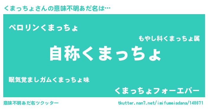 | 男性向けラノベタイトル風あだ名 | 『Re:くまっちょから始める異世界生活』 |
