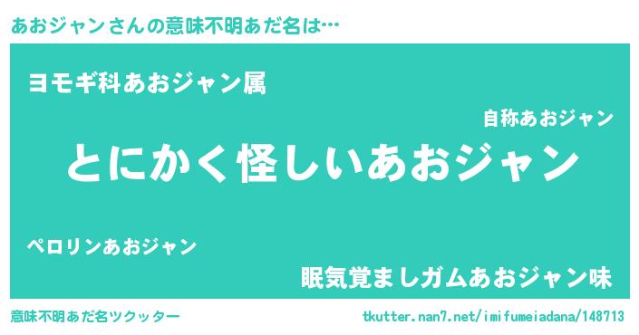 | 男性向けラノベタイトル風あだ名 | 『うちのあおジャンが世界を掌握している!』 |