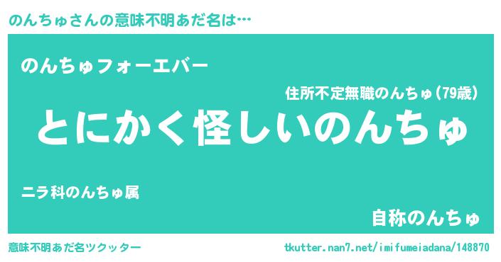 | 男性向けラノベタイトル風あだ名 | 『ダンジョンにのんちゅを求めるのは間違っているだろうか』 |