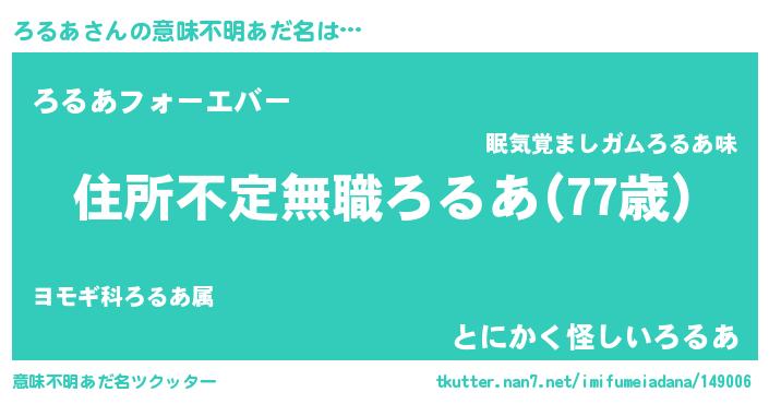| 男性向けラノベタイトル風あだ名 | 『ろるあに滅ぼされるだけの簡単なお仕事です』 |