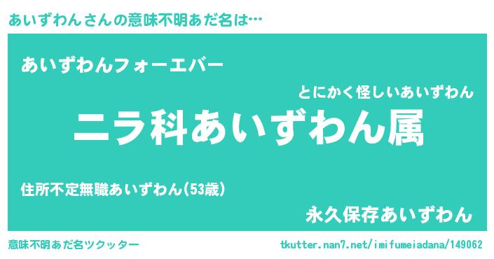 | 男性向けラノベタイトル風あだ名 | 『あいずわん~年齢イコール彼女いない歴の魔法使い~』 |