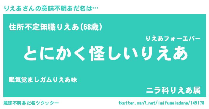 | 男性向けラノベタイトル風あだ名 | 『りえあの嫁は女の子じゃないと思った?』 |