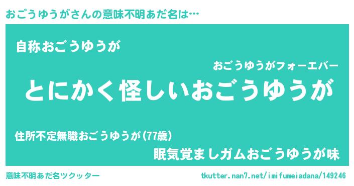 | 男性向けラノベタイトル風あだ名 | 『うちのおごうゆうがが世界を掌握している!』 |