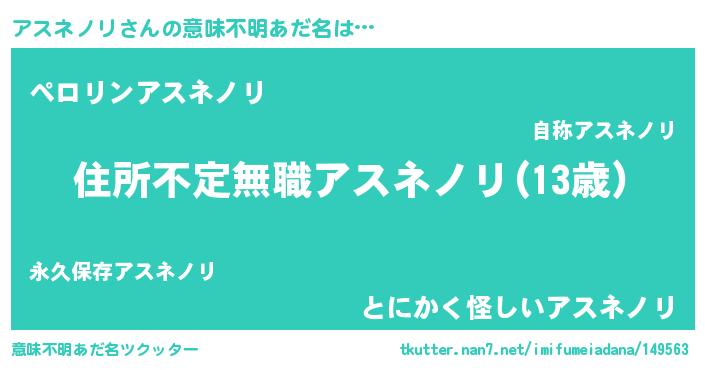 | 男性向けラノベタイトル風あだ名 | 『アスネノリに滅ぼされるだけの簡単なお仕事です』 |