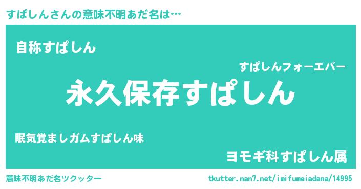 | 男性向けラノベタイトル風あだ名 | 『すぱしんという概念が存在しない退屈な世界 』 |