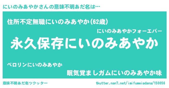 | 胡散臭い通販商品みたいなあだ名 | 『来世でも幸せになれる健康食品…その名も「にいのみあやか」』 |