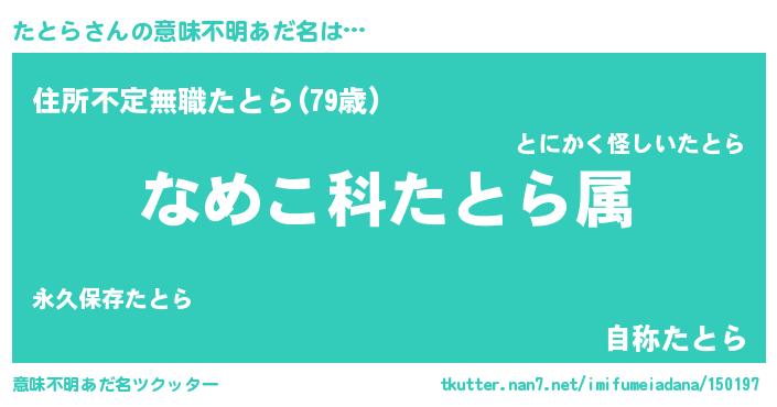 | 男性向けラノベタイトル風あだ名 | 『転生したらたとらだった件』 |