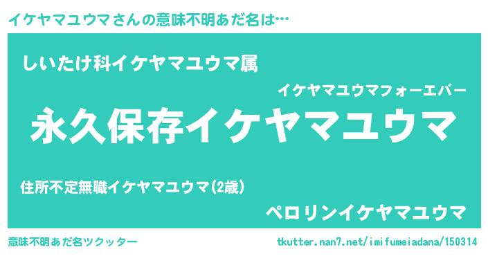| 胡散臭い通販商品みたいなあだ名 | 『来世でも幸せになれる健康食品…その名も「イケヤマユウマ」』 |