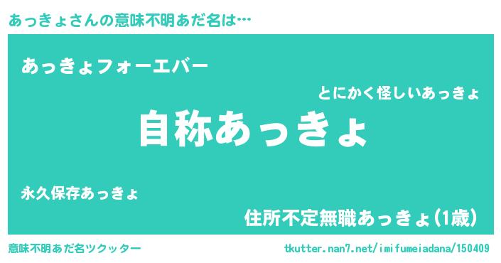 | 男性向けラノベタイトル風あだ名 | 『Re:あっきょから始める異世界生活』 |