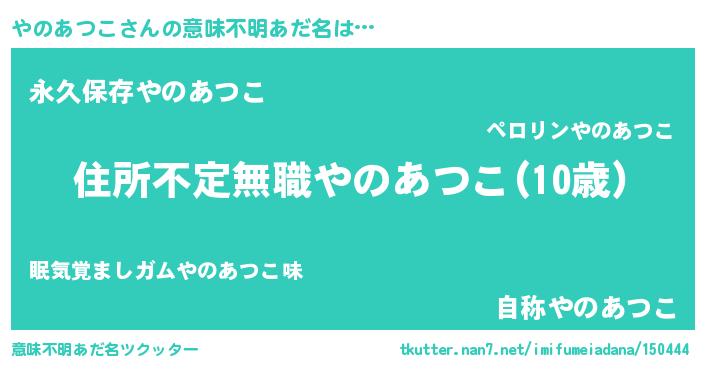 | 女子向けラノベタイトル風あだ名 | 『やのあつこが死なない童話 林檎のやのあつこの診療簿』 |