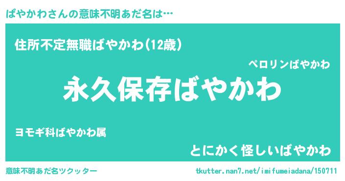 | 女子向けラノベタイトル風あだ名 | 『異世界で失敗しない100のばやかわ』 |