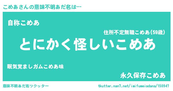 | 女子向けラノベタイトル風あだ名 | 『こめあは平凡を望む』 |